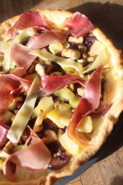 Je triche un peu mais le titre aurait trop long… J’avais quelques restes à écouler et l’envie d’une tarte sans appareil depuis un petit moment. Mais, je voulais tout de même que ça reste appétissant, tant qu’à faire… Alors qu’y a t-il dans cette tarte ?