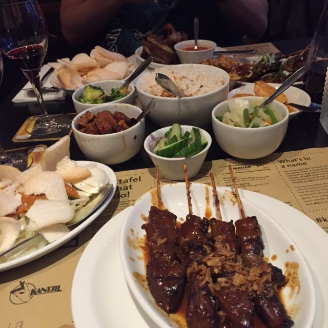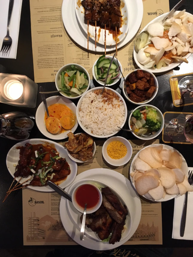 Et quand on a qu’une soirée, rien de mieux qu’un rijsttafel ! Gné ? Rijsttafel signifie le riz sur la table et selon la nourriture indonésienne doit être une célébration de saveurs. Il doit donc y avoir autant de choses que possible sur la table et le riz est au centre de l’attention.